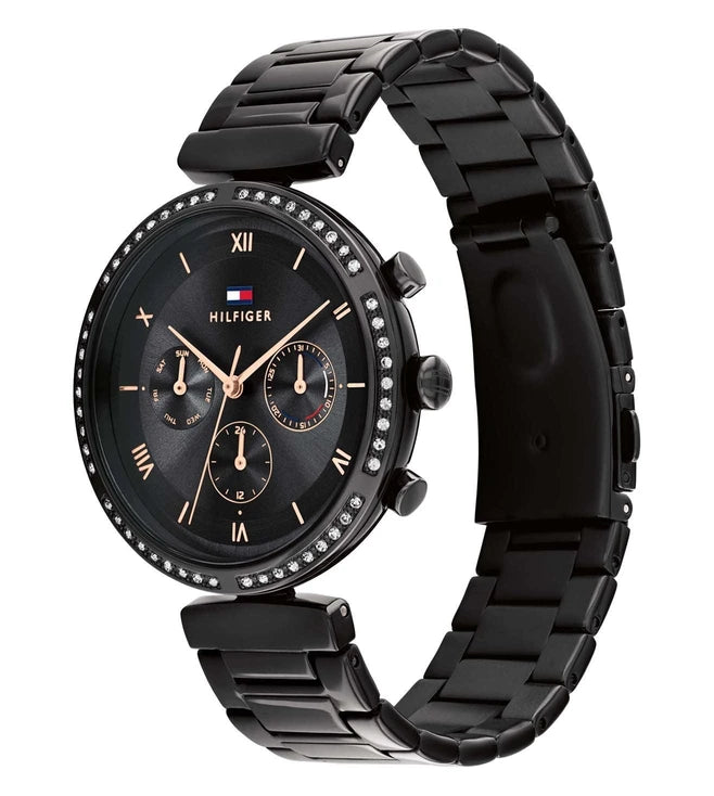 Get a pretty look by sporting this women's analog watch from the Luna collection by Tommy Hilfiger. Its round-shaped black dial bears a multifunction functionality to show you what the time is. The stainless steel bracelet of this watch exudes a black hue for an eye-catching look. Its push button clasp ensures a secured grip around the wrist.