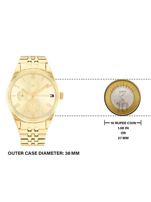 Boost your style by sporting this women's analog watch from the Monica collection by Tommy Hilfiger. Its round-shaped gold-toned dial is protected in a case of 38 mm diameter. The stainless steel bracelet of this watch exudes a gold hue for an eye-catching look. Its push button clasp ensures a secured grip around the wrist. The inclusion of a multifunction quartz movement keeps you on time.