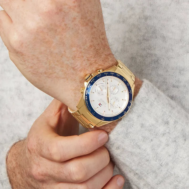 Get a chic look by wearing this men's analog watch from Tommy Hilfiger. Its round-shaped white dial is protected in a case of 46 mm diameter. The stainless steel bracelet of this watch exudes a golden hue for an eye-catching look. The inclusion of multifunction quartz movement keeps you on time. Its push button clasp ensures a secured grip around the wrist.