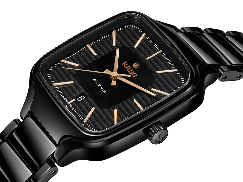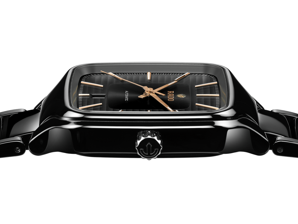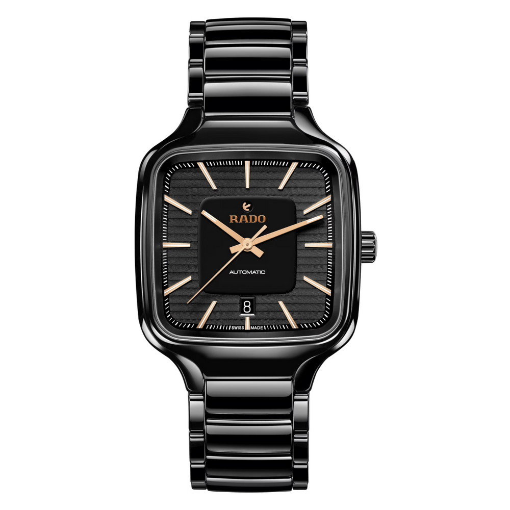 The True Square has a diameter of 38 mm and consists of a polished black high-tech ceramic case and crown and a flat sapphire crystal. Thanks to a Rado R763 automatic movement, the watch keeps precise and reliable time. The rose gold coloured hands and indexes with white Super-LumiNova® match perfectly with the dial that includes a black stamped horizontal structure. The watch is equipped with 80 hours of power reserve and has a water resistance of 5 bar. The pleasant wearing comfort of the True Square is ensured by a black polished high-tech ceramic bracelet with a titanium 3-fold clasp.