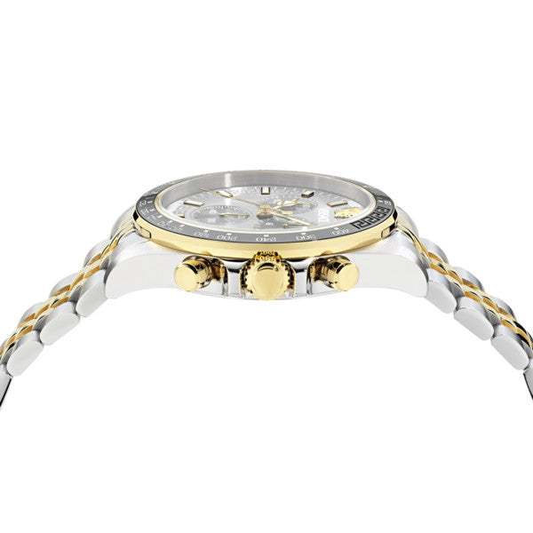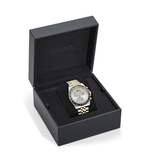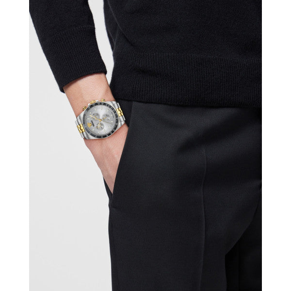 ntroducing the Greca Chrono Wave by Versace, a bold masculine timepiece designed for the modern gentleman. With its sleek 43mm case and precise chrono movement, it exudes confidence and functionality. Featuring a top ring adorned with a bold Greek motif and tachymeter numbers, it seamlessly blends sporty aesthetics with Versace's distinctive DNA.