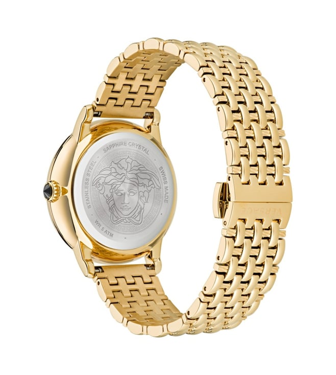 This delicate watch is crafted in a timeless style. Enriched with a sleek dial of height 38 mm and case thickness 12.8 Mm, the roman numerals and a medusa at the 12h position, this watch is designed with a traditional sensibility. The watch case is encircled by the greca pattern on the inner dial and top ring for an iconic look.