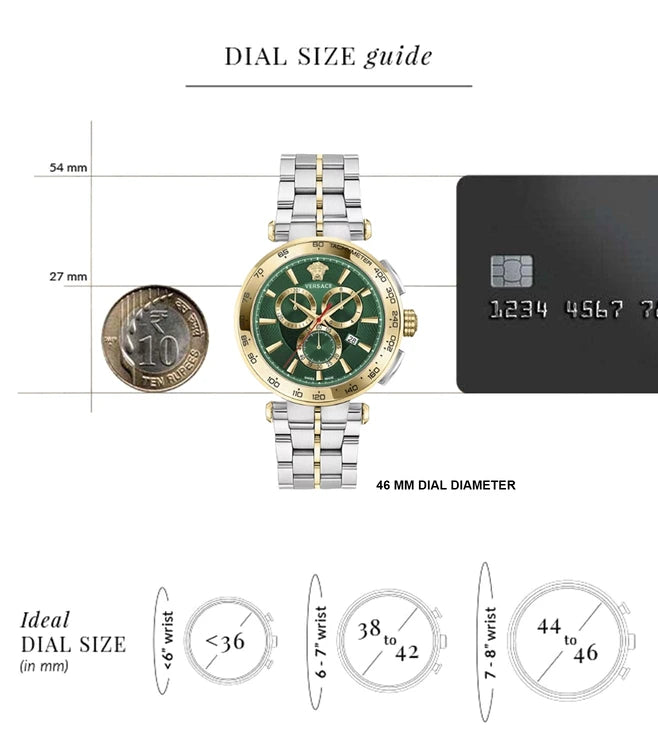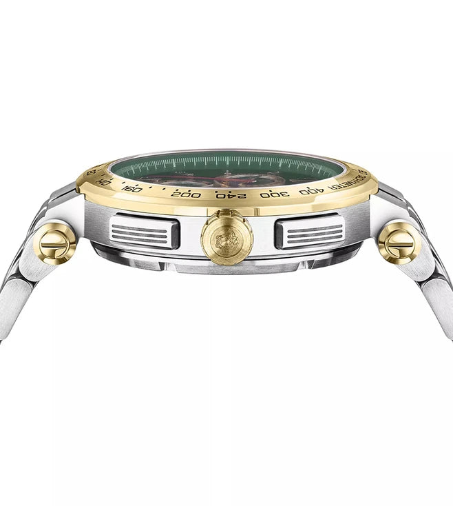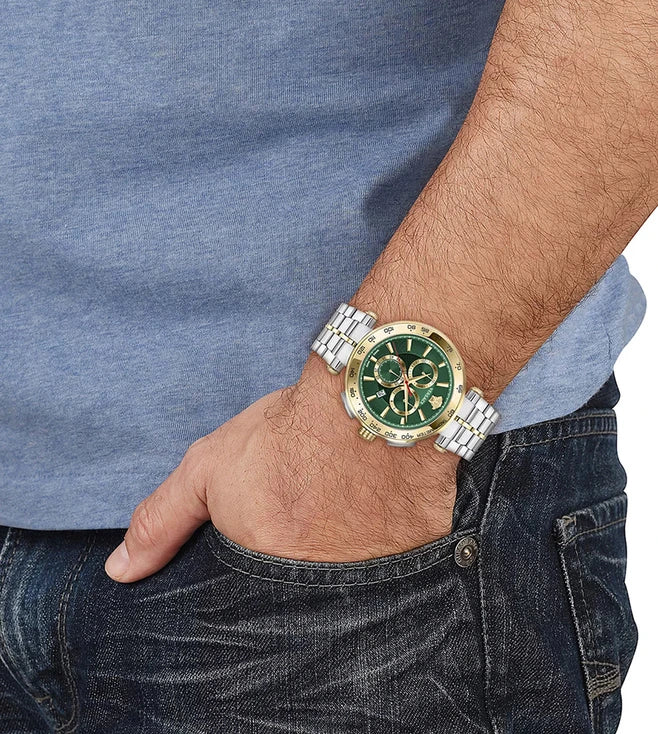 Expertly crafted, the Versace Green Dial Chrono Quartz 46 mm Dial Men Watch is a perfect choice for any man looking for both style and function. Featuring a sleek green dial and precise quartz movement, this timepiece exudes sophistication and reliability. Get yours today and elevate your wrist game.