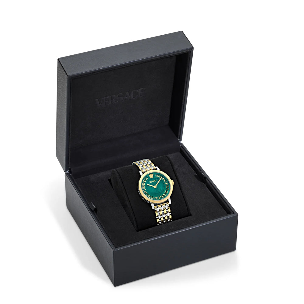 Versace's "Greca Fortuna" watch merges heritage with modernity. The iconic case reflects Versace's accessory patterns, with a slanting Greca on the top ring for depth. Adorned with three-dimensional studs, it exudes opulence. Lugs frame the dial with the Versace logo, alongside a striking 3D Medusa at 12 o' clock. Featuring the celebrated 3D La Greca pattern, it epitomizes timeless elegance, available in vibrant leather straps or delicate mesh bands.