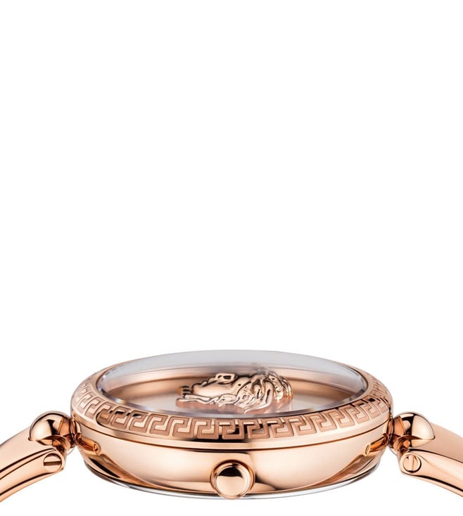 The Palazzo Empire is back, chic and sophisticated as always, with this watch in a sleek 34 mm diameter case, for an extremely feminine fit. The iconic style remains unchanged, the central Medusa icon takes center stage, tone-on-tone Greek key engraving decorates the bezel, and the guilloche sunray dial tone matches the semi-bangle bracelet in a jewellery inspired version. It also features case thickness of 10.70 mm.