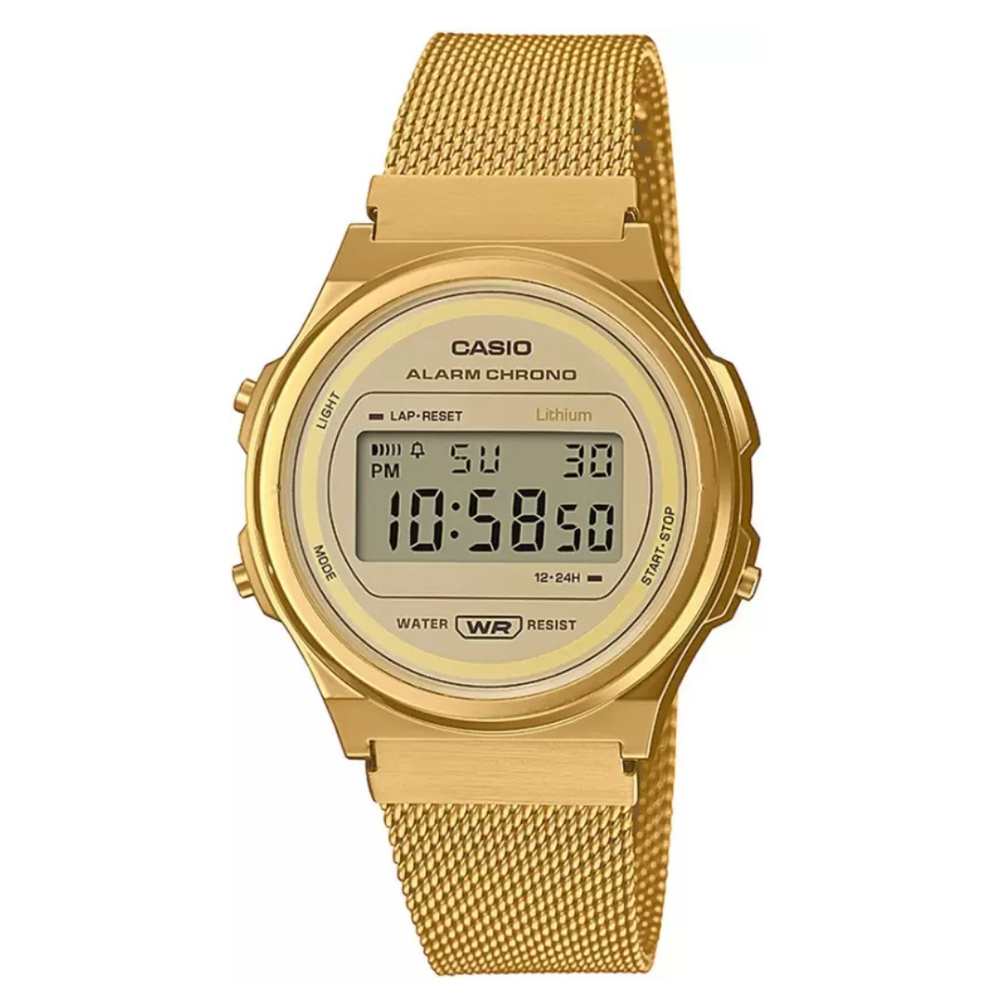 Introducing the A171 Series of round-face, unisex timepieces.Uncluttered monotone coloring combines with middle-sized unisex designs that go great with a wide variety of styles.The bands feature a slide-type clasp that lets you easily adjust the band length without special tools.Features and functions include calendar and stopwatch capabilities, along with everyday wear water resistance and LED light illumination for easy reading in the dark.