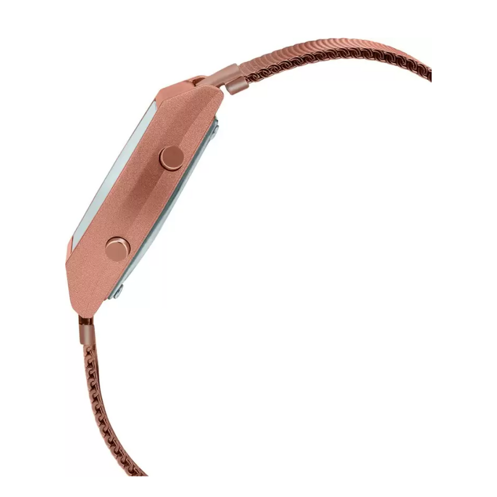 Add a dash of cheerfulness to your personality with this unisex digital watch from the Vintage collection by Casio. The rose gold rectangular dial is nestled in a beautiful case. It showcases chronograph and a crown for time adjustment. The stainless steel strap flaunts a rose gold hue that elevates the look of the watch.