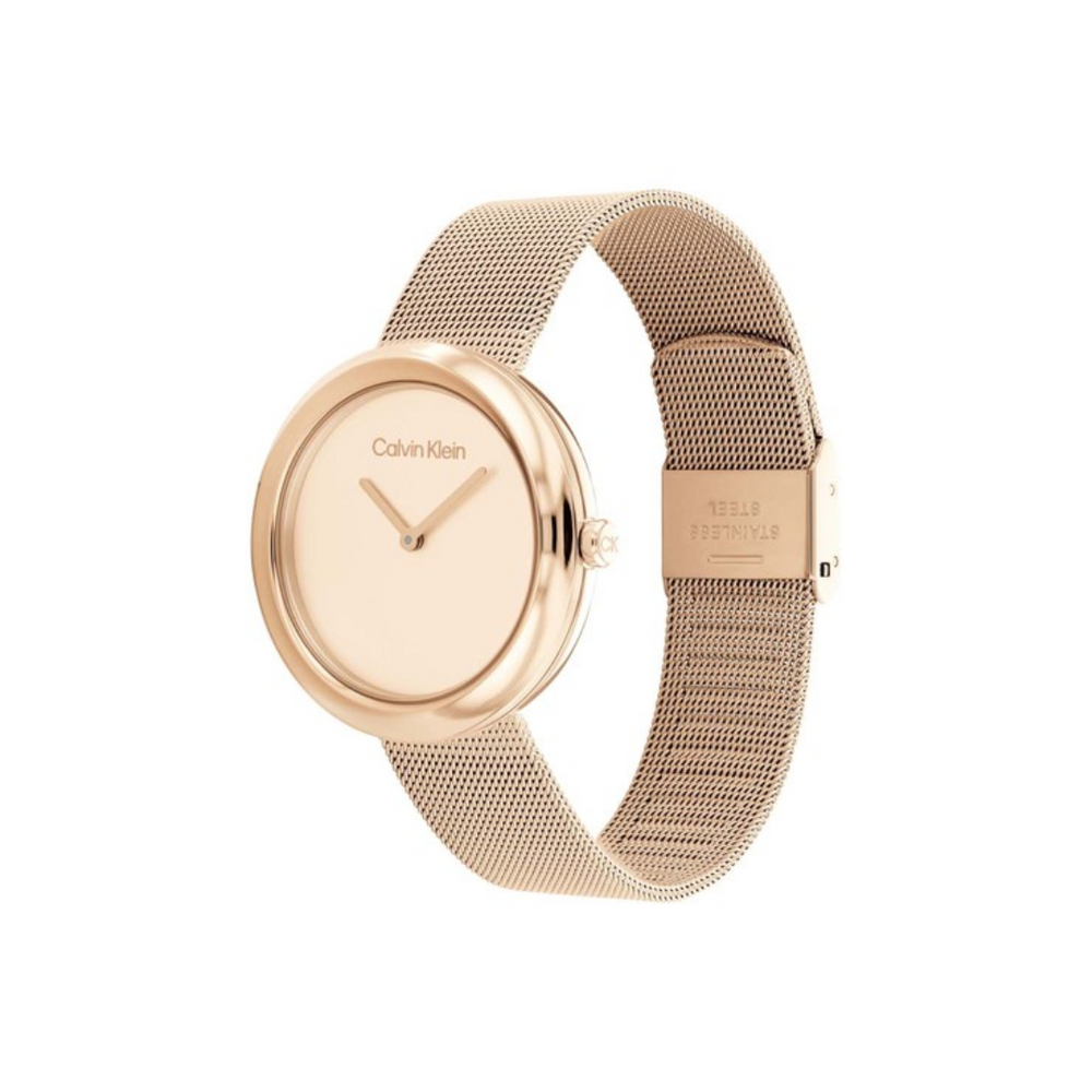 This Calvin Klein watch offers a minimalistic design with a classic round metal case for women. True to its name, the Twisted Bezel collection takes one step ahead in your fashion journey, featuring unique spiral-like bezel and alluring sculpted lines. A clean, sophisticated dial complimented with a stylish mesh bracelet rounds off the look.