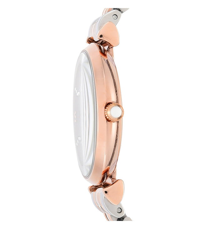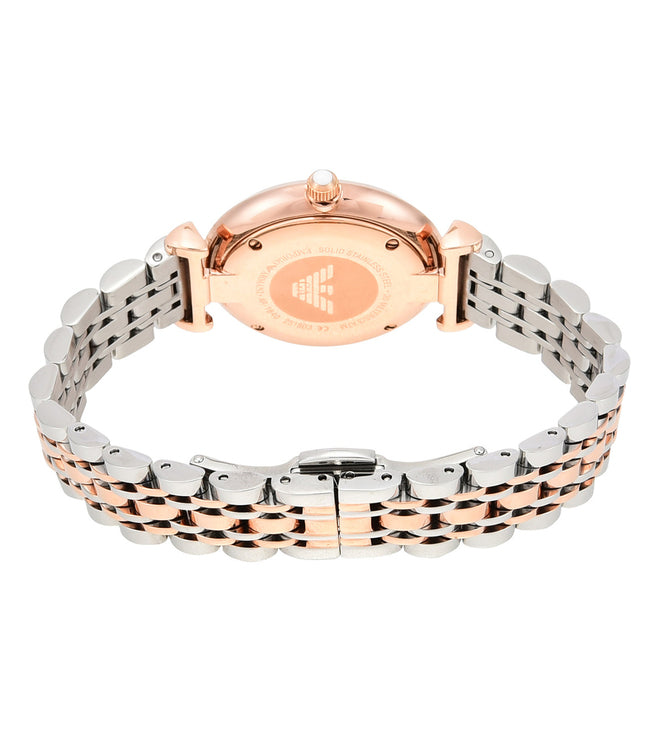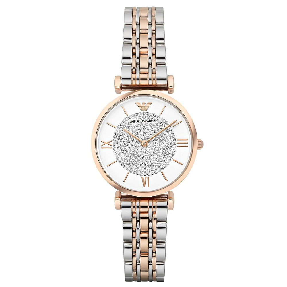 Emporio Armani's 32mm watch features a white matte, pavé dial, two-hand movement and two-tone stainless steel bracelet.