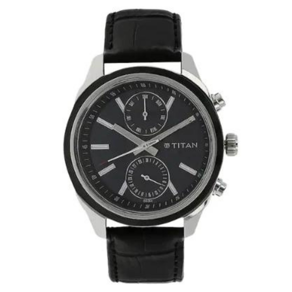 This multifunction watch for men features a blue round dial, housed within a metal case. Its dial has plain three hands and separate sub-dials for day and date. Made of leather, the black strap comes with buckle closure. Three crowns let you adjust the time, day and date. The timepiece is user-friendly as it comes with a 5 ATM water resistant feature and with a 24 month warranty.