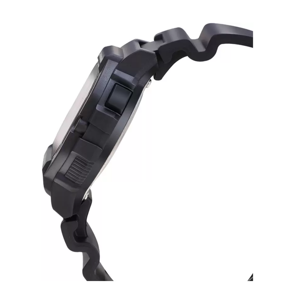Casio watch for men, featuring a black dial, a grey strap made of resin in a octagon case. Built with resin glass and resin body to balance clarity and durability. Dimensions include 50 mm dial size, 21 mm strap width, 12 mm profile for comfortable wear. Key features: quartz movement, digital display, 5 atm water resistance. A secure buckle clasp ensures a dependable fit.