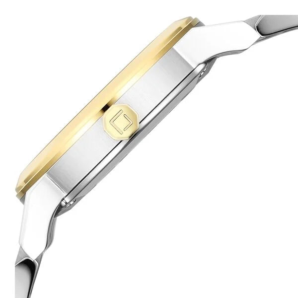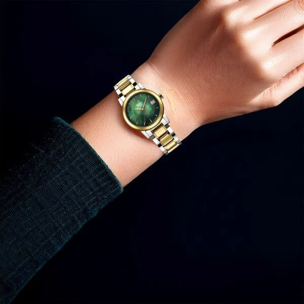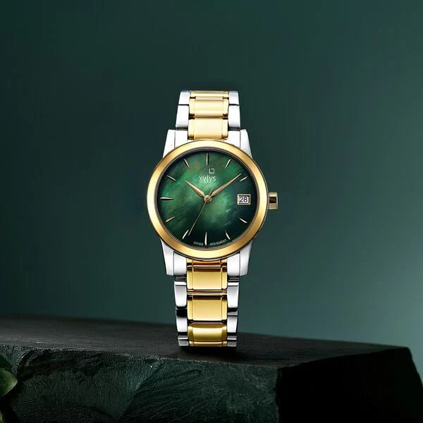 Part of the Ethereum collection, this timepiece is powered by the reliable Swiss-made Ronda Calibre 515 movement. Designed with a bold yet elegant geometric form, it balances strong personality with grace. The case is made from 316L stainless steel, complemented by a yellow gold-plated bezel and crown. The dial is crafted from Mother of Pearl in a rich emerald green hue, featuring a date window at 3 O'clock for everyday functionality. Yellow gold-plated angle-cut hands and indices enhance the watch's refined finish, while the integrated bracelet boasts a dual-finish treatment of polished 316L stainless steel side links and yellow gold-plated centre links. Sapphire glass with six layers of anti-reflective coating ensures crystal-clear visibility. Water-resistant up to 5 ATM, this watch offers both luxury and practicality.