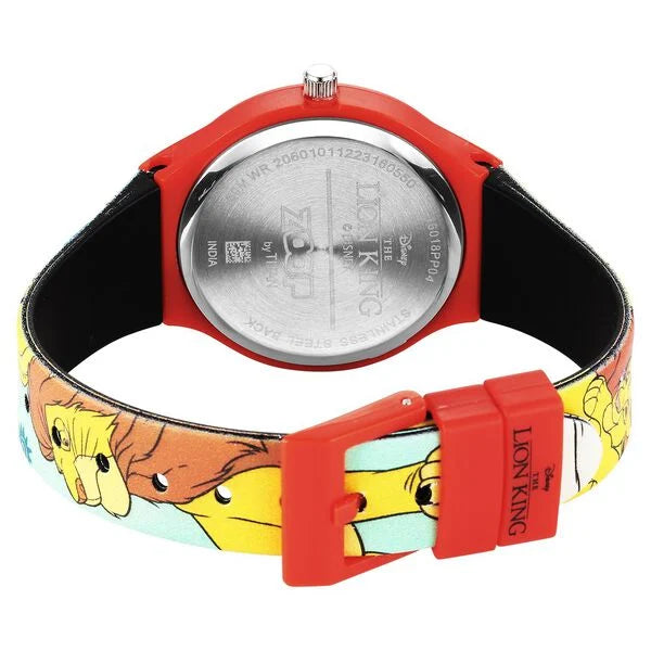 Add a stylish dimension to your look by wearing this unisex's analog with 3 straps watch from the Disney collection by Zoop. Covered by a , the orange round dial is nestled in a 43.5 mm case. It vaunts plain three hands, DETAILS and a crown for time adjustment. The pu strap exudes a multicolor hue that accentuates the look of the watch. Moreover, it is fitted with a buckle clasp that ensures a secure fit on the wrist.