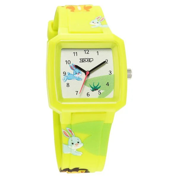 Simple yet stylish, this unisex's analog watch from the Forest Story collection by Zoop will be a perfect pick for you. Its silicon strap flaunts a yellow hue that accentuates the look of the watch. The white square dial is secured by a and is encased in a 39 mm case. It exudes plain three hands, DETAILS and a crown for time adjustment. Furthermore, it is completed with a buckle clasp that ensures a secure fit on the wrist.
