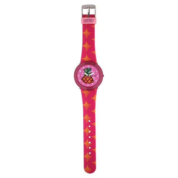 Style arrives effortlessly the moment you wear this smartly designed unisex's analog watch from the Fruit Story collection by Zoop. Protected by a , the pink round dial is nestled in a 38.3 mm case. It vaunts plain two hands, DETAILS and a crown for time adjustment. The pu strap comes in a pink hue that further elevates the look of the watch. Moreover, it is fitted with a buckle clasp that ensures a secure fit on the wrist.