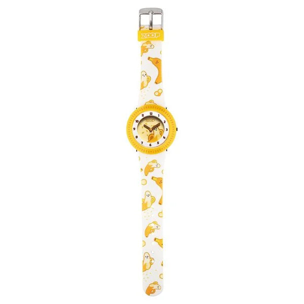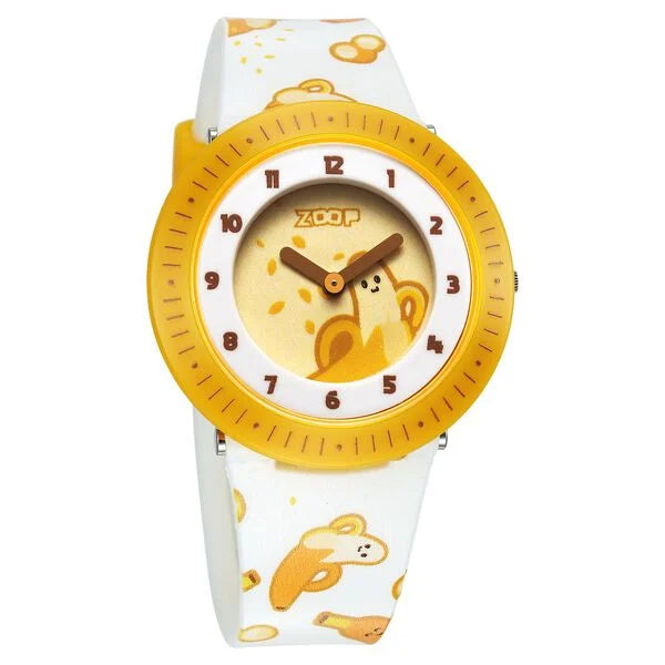 Get hold of this stylish unisex's analog watch from the Fruit Story collection by Zoop and make a distinct style statement. Secured by a , the yellow round dial is housed in a 38.3 mm case. It exhibits plain two hands, DETAILS and a crown for time adjustment. The pu strap showcases a white hue that uplifts the look of the watch. Moreover, it is fitted with a buckle clasp to ensure a secure fit on the wrist.