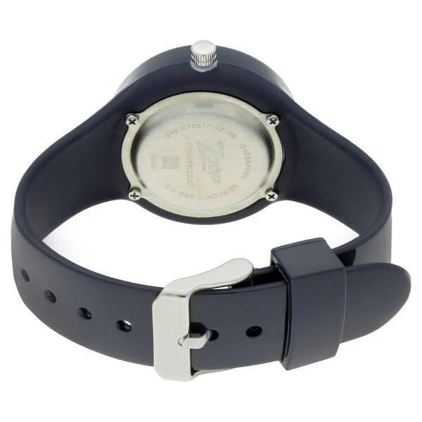 This watch has a beautifully printed dial and stone studded baton indices along with Arabic numeral indices that indicate time in both hours and minutes. The watch has a purple strap with a buckle clasp for fastening. The watch resists water up to 3 ATM.