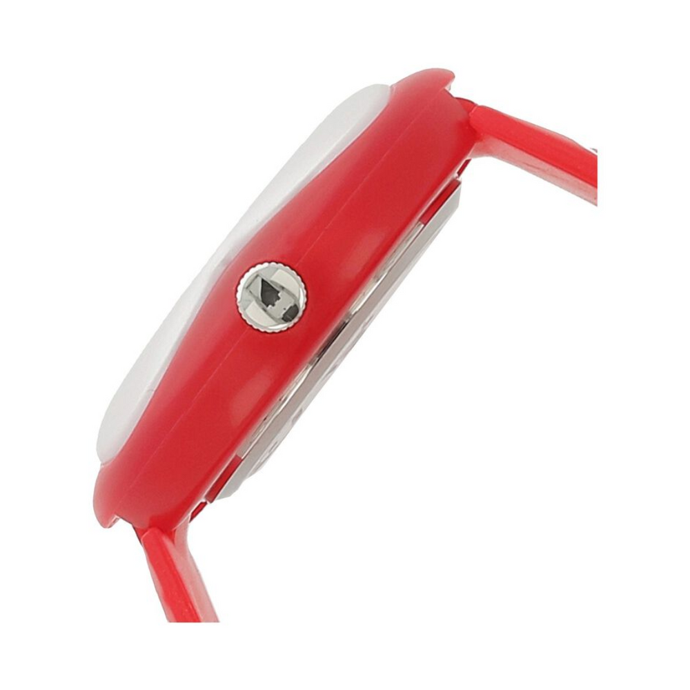 This analog, Kids watch for kids has plain two hands on a white, round-shaped dial. The case is plain and pink in colour with the dial having Arabic numerals at intervals of 5 minutes, quartz movement, a back casing that is made of stainless steel and a crown to adjust the time. Made of plastic, the strap is multicoloured and has a comfortable buckle clasp closure. The watch comes with a 12 month international warranty and its water-resistant depth is upto 3 ATM. The unique feature of this watch is the small pink flower in the middle of the dial.