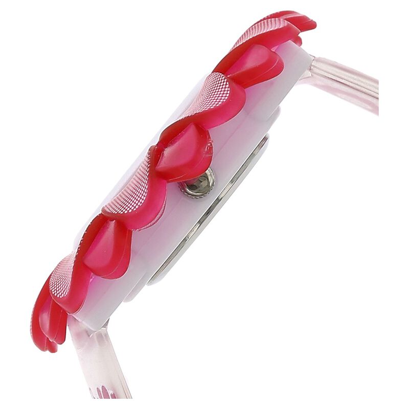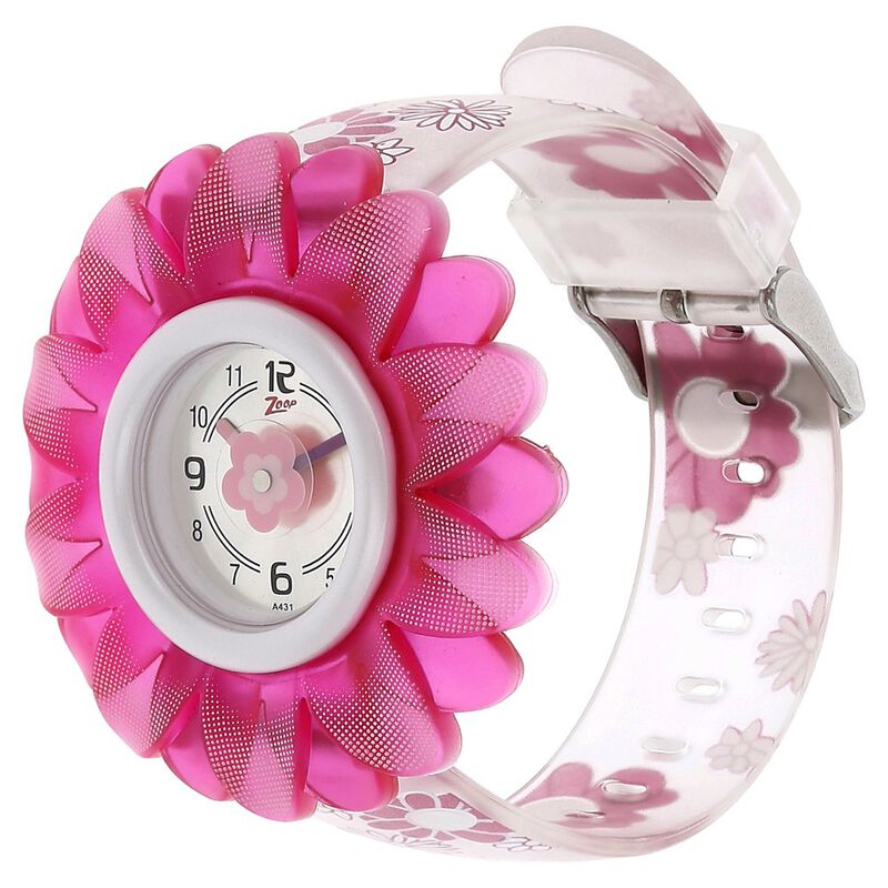Featuring a pink floral design with double layers of petals, this watch has a silver dial and indicates time with Arabic numeral indices. It has a stainless steel case. It comes with a transparent printed multicoloured strap that has a buckle clasp. The water resistance of this watch is up to 3 ATM.