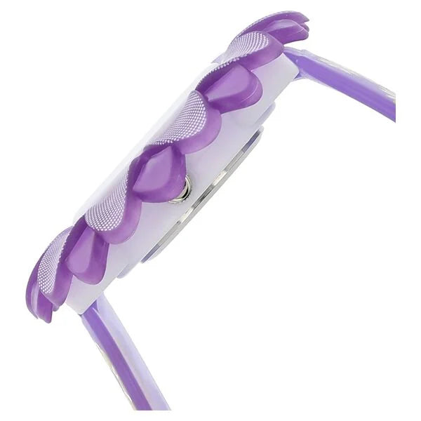 This analog watch for girls features a round silver dial with plain two hands. The hour hand is in yellow and minute hand is in purple. Markings are present at hour intervals in form of Arabic numerals. The silver case is round is surrounded by purple petal and comes with stainless steel back casing. The strap of this watch is made of plastic material and is multicoloured in purple and yellow. It is water resistant up to 3 ATM.