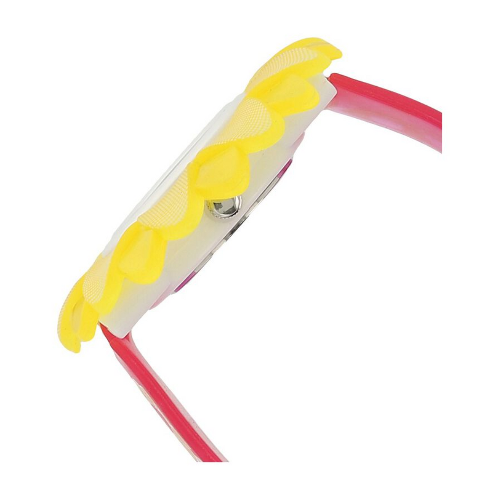 This watch features a silver dial along with a yellow coloured floral detail around the bezel. It has Arabic numerals as indices to indicate time. The dial is housed in a stainless steel case. It has a pink plastic strap that is semi-transparent with floral prints. The watch can withstand water up to 3 ATM.