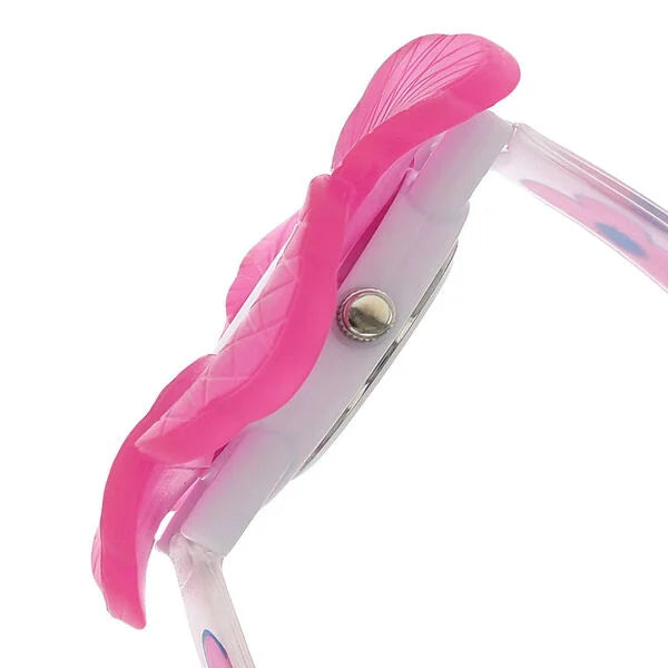 Bright and funky, this analog watch for girls from Zoop is sure to impress your little princess. Encased in a pink petal design outer rim, the silver round dial features plain two hands and Arabic numerals that facilitate reading ease. Crafted from premium quality plastic, the strap flaunts a shade of pink that elevate its look. To ensure your child's wrist a proper fit, it comes with a buckle clasp.