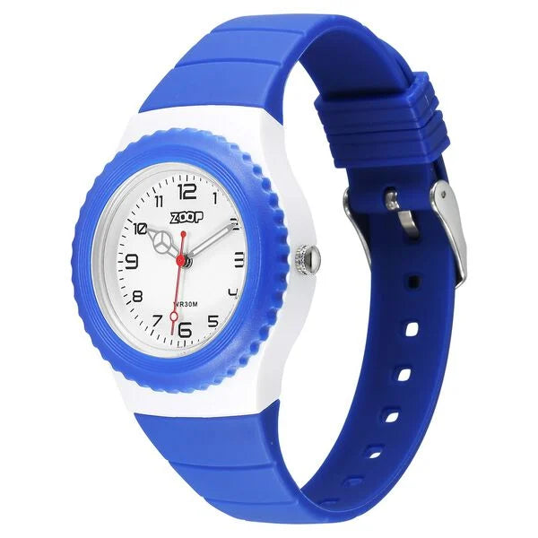 Impress those around you by sporting this analog watch from the Sport collection by Zoop. Encased in a 35.7 mm case, the white round dial features plain 3-hand functionality and quartz movement on the watch. The polyurethane strap comes in a blue hue that further elevates the look of the watch. Besides, it is water resistant up to 30 m and is completed with a buckle to ensure a secure fit on the wrist.