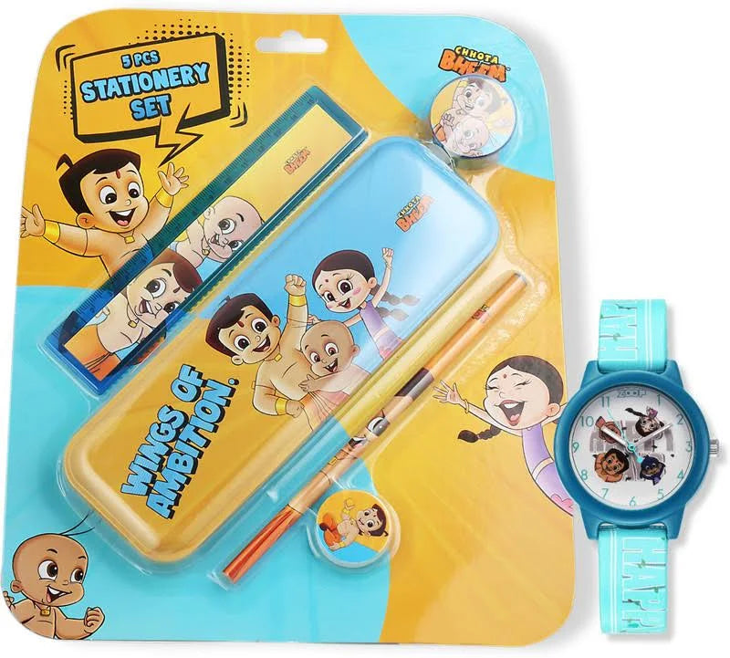 This collection of Chhota Bheem Watches is fun, durable, and colorful and makes a perfect accessory to bringing their favorite hero along for every moment of the day. With every purchase comes a free stationery set.